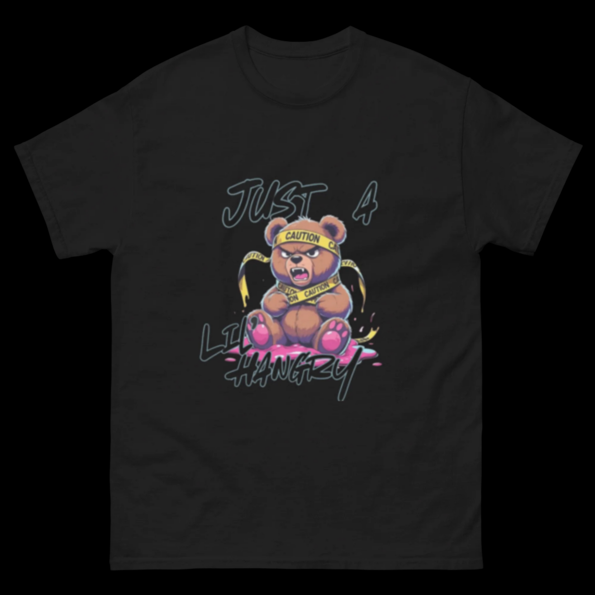 The Just a Lil Hangry Tee features a wild-eyed bear wrapped in caution tape, letting the world know: it’s not an attitude… it’s low snacks. A perfect mix of bold streetwear and playful chaos — because sometimes the mood hits before the meal does.
